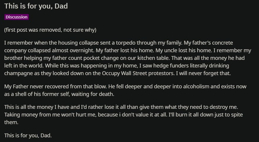 In one case we saw this month, the ‘us versus them’ instinct was directed towards calling the other side pedophilic, Satan-worshipping baby-eaters. Which was much worse. In another scenario, the ‘us versus them’ mentality was directed towards Wall Streeters who were bailed out by the taxpayer in spite of their irresponsibility in the lead-up to the 2008 Financial Crisis. Gazing across the r/WallStreetBets there are many users who post messages about how their investment into GameStop is a statement more than a money-making venture. For Redditors such as the one below, the financial crisis affected them and their families pretty harshly and they took note of the preferential treatment of finance in comparison to the average American.